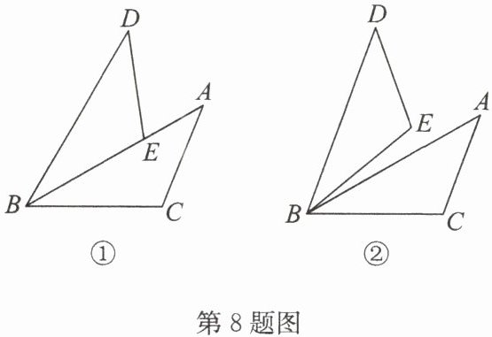 8. 如图,将$△ ABC$绕点$B$逆时针旋转得到$△ DBE$。