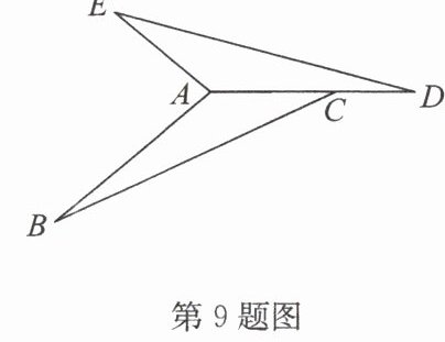 答案:9. 解:因为$△ ABC$逆时针旋转一定角度后与$△ ADE$重合,A 为公共顶点,所以旋转中心为点 A.根据旋转的性质可知$∠CAE=∠BAD=180^{\circ}-∠B - ∠ACB=180^{\circ}-15^{\circ}-25^{\circ}=140^{\circ}$,所以旋转的角度为$140^{\circ}$.因为$∠CAE=∠BAD=140^{\circ}$,所以$∠BAE=360^{\circ}-∠CAE - ∠CAB=360^{\circ}-140^{\circ}-140^{\circ}=80^{\circ}$.