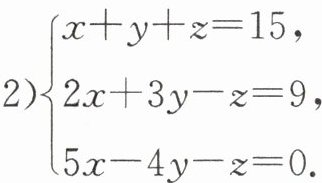 (2) $\{\begin{array}{l} x+y+z=15,①\\ 2x+3y - z=9,②\\ 5x - 4y - z=0,③\end{array} $