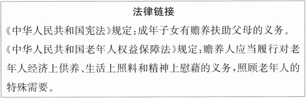 材料二 因丈夫早年病故,周女士一人含辛茹苦将两个子女抚养成人。两个子女一个在企业上班,一个开了一家公司,经济条件都不错。周女士已经 80 岁,无法独立生活,但子女无反哺之心,相互推诿,拒不履行赡养义务。老人悲愤之下一纸诉状将两个子女告上法庭。经过法院调解,两个子女最终达成协议,轮流赡养照顾老人,尽量让老人享受天伦之乐。