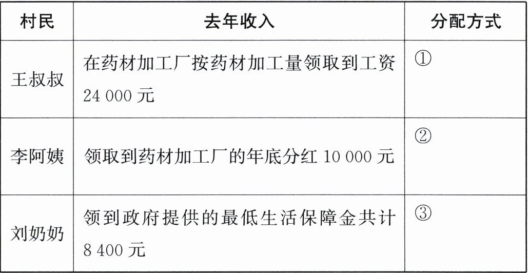 活动三 为了让同学们更好地理解我国的基本经济制度,第三组同学对某村办药材加工厂开展了实地调查。在该村药材加工厂开办的第一年,村民们的收入就较往年翻了一倍。同学们针对村民去年的收入做了走访调查,并制作出下表: