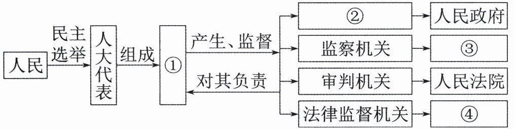 。(4 分)从材料中你能读出哪些信息?(6 分)答案:(1) ① 人民代表大会;② 行政机关;③ 监察委员会;④ 人民检察院。(每点 1 分,共 4 分) 体现观点:① 国家的一切权力属于人民,人民是国家的主人;② 人民代表大会是国家权力机关,其他国家机关由它产生,对它负责,受它监督;③ 人民代表大会制度是我国的根本政治制度,保障人民当家作主。(每点 2 分,答出其中两点即可,共 4 分) (2) ⑤ 全国人大常委会表决通过 ⑥ 国家主席公布法律(每空 2 分,共 4 分) ① 中国共产党领导是中国特色社会主义最本质的特征。② 全国人大是最高国家权力机关,全国人大常委会行使国家立法权。③ 国家主席根据全国人大和全国人大常委会的决定,依法行使公布法律、发布命令的职权。(每点 2 分,共 6 分)