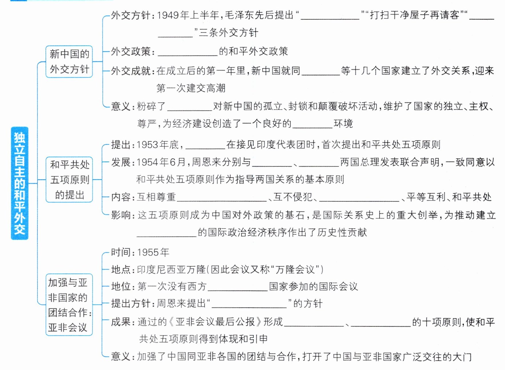 答案:另起炉灶 一边倒 独立自主 苏联 帝国主义 外部 周恩来 印度 缅甸 主权和领土完整 互不干涉内政 公正合理 殖民主义 求同存异 和平共处 友好合作