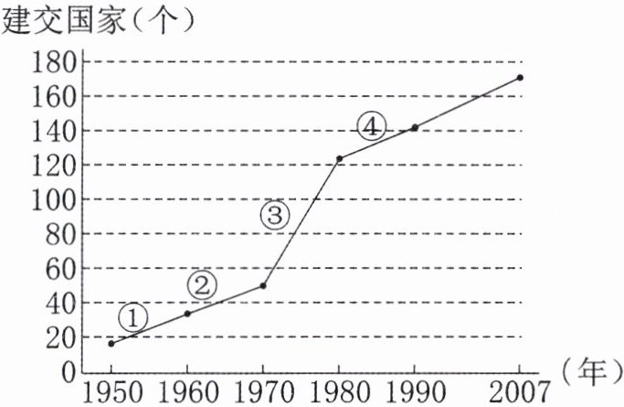 5. 下图是我国与各国建立外交关系情况简图(累计)。我国首次提出和平共处五项原则的时间段是图中的(