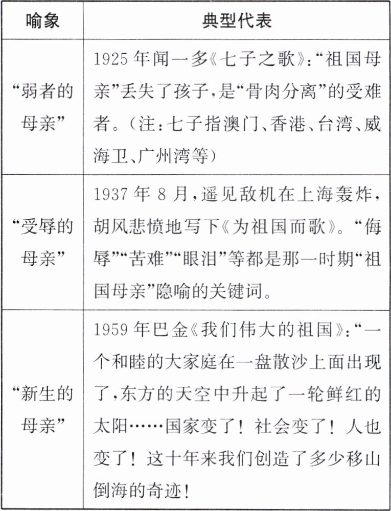 材料 “祖国—母亲”是爱国主义教育中常见的话语象征。下表是这一政治隐喻在中国近现代产生与发展过程中的几个片段。