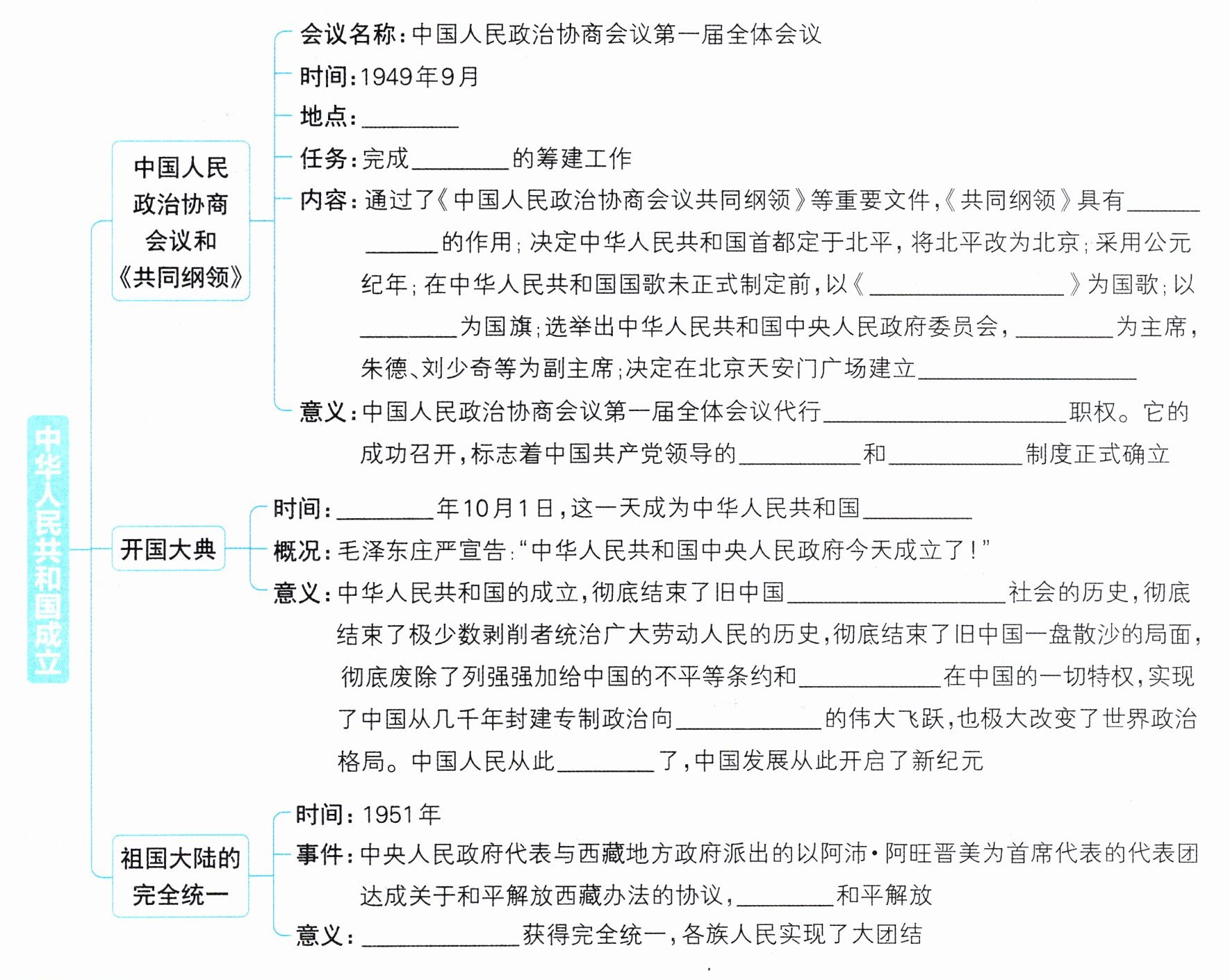 答案:北平 新中国 临时宪法 义勇军进行曲 五星红旗 毛泽东 人民英雄纪念碑 全国人民代表大会 多党合作 政治协商 1949 国庆日 半殖民地半封建 帝国主义 人民民主 站起来 西藏 祖国大陆