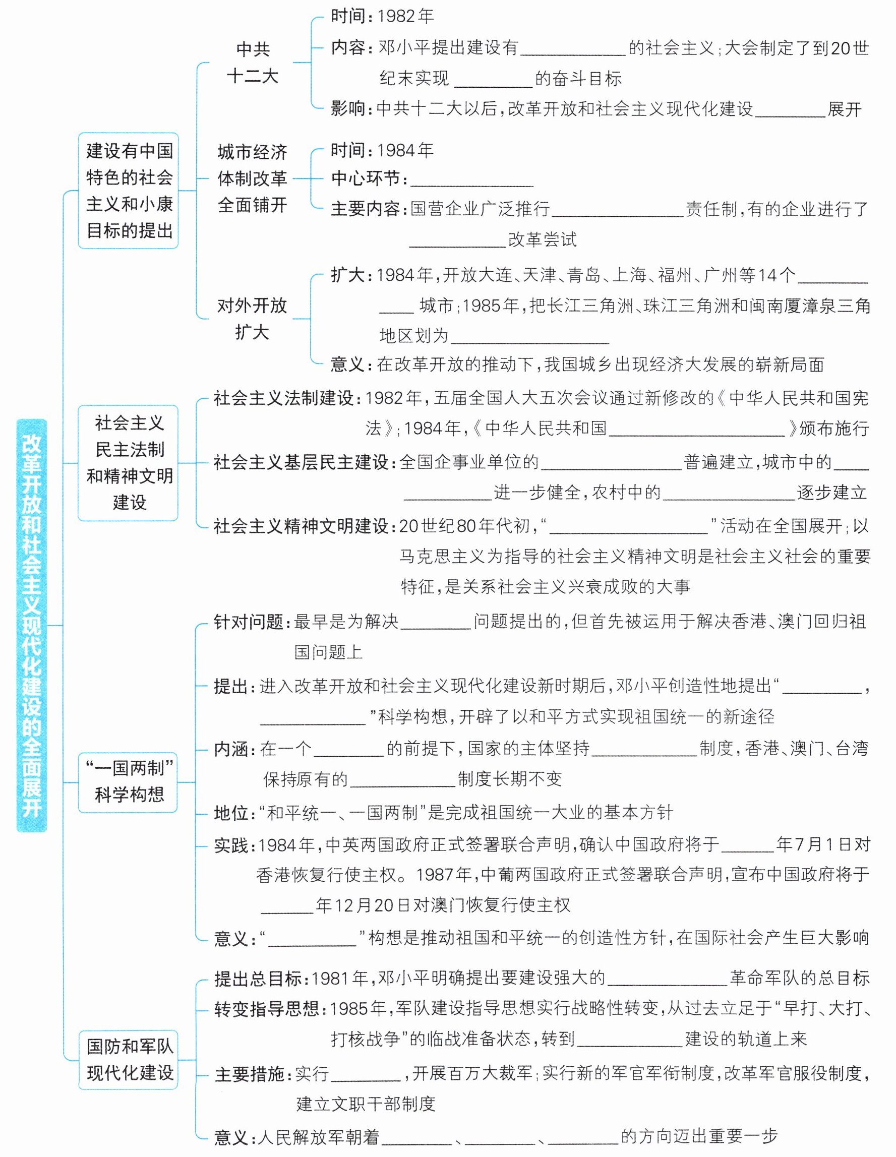 中国特色 小康 全面 增强企业活力 承包经营 股份制 沿海港口 沿海经济开放区 民族区域自治法 职工代表大会 居民委员会 村民委员会 五讲四美三热爱 台湾 一个国家两种制度 中国 社会主义 资本主义 1997 1999 一国两制 现代化正规化 和平时期 精简整编 精兵 合成 高效