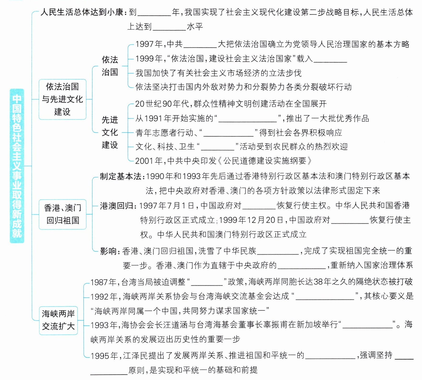 答案:2000 小康 十五 宪法 五个一工程 希望工程 三下乡 香港 澳门 百年耻辱 特别行政区 三不 九二共识 汪辜会谈 八项主张 一个中国