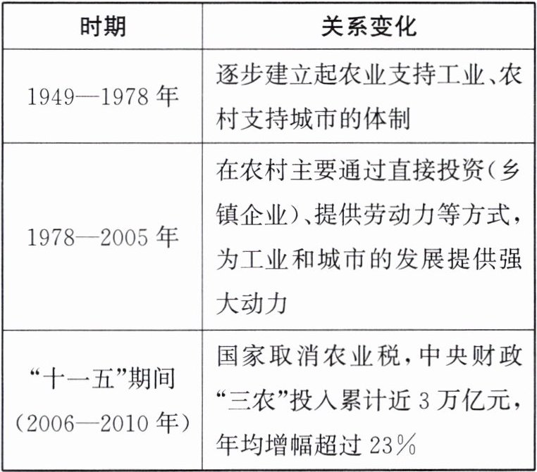 答案:5. C 解析:根据表格内容分析,新中国成立后,首先是农业支持工业的发展,工业发展以后又反哺农业推进城乡协调发展,C 项符合题意;农业支持了工业发展,但直接助推国家实现工业化说法错误,排除 A 项;乡镇企业发展改善了国家工业布局与表格内容无关,排除 B 项;国家取消农业税,但当时并没有全面消除农村贫困,排除 D 项。故选 C 项。