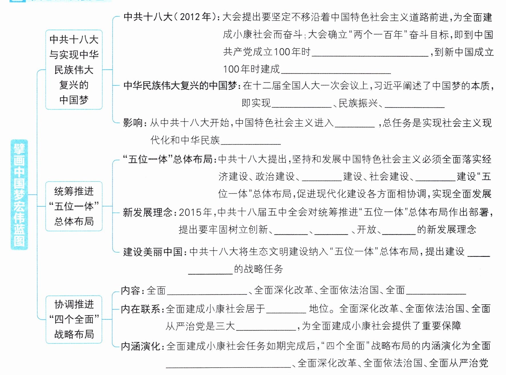 答案:全面建成小康社会 社会主义现代化国家 国家富强 人民幸福 新时代 伟大复兴 文化 生态文明 协调 绿色 共享 美丽中国 建成小康社会 从严治党 引领 战略举措 建设社会主义现代化国家