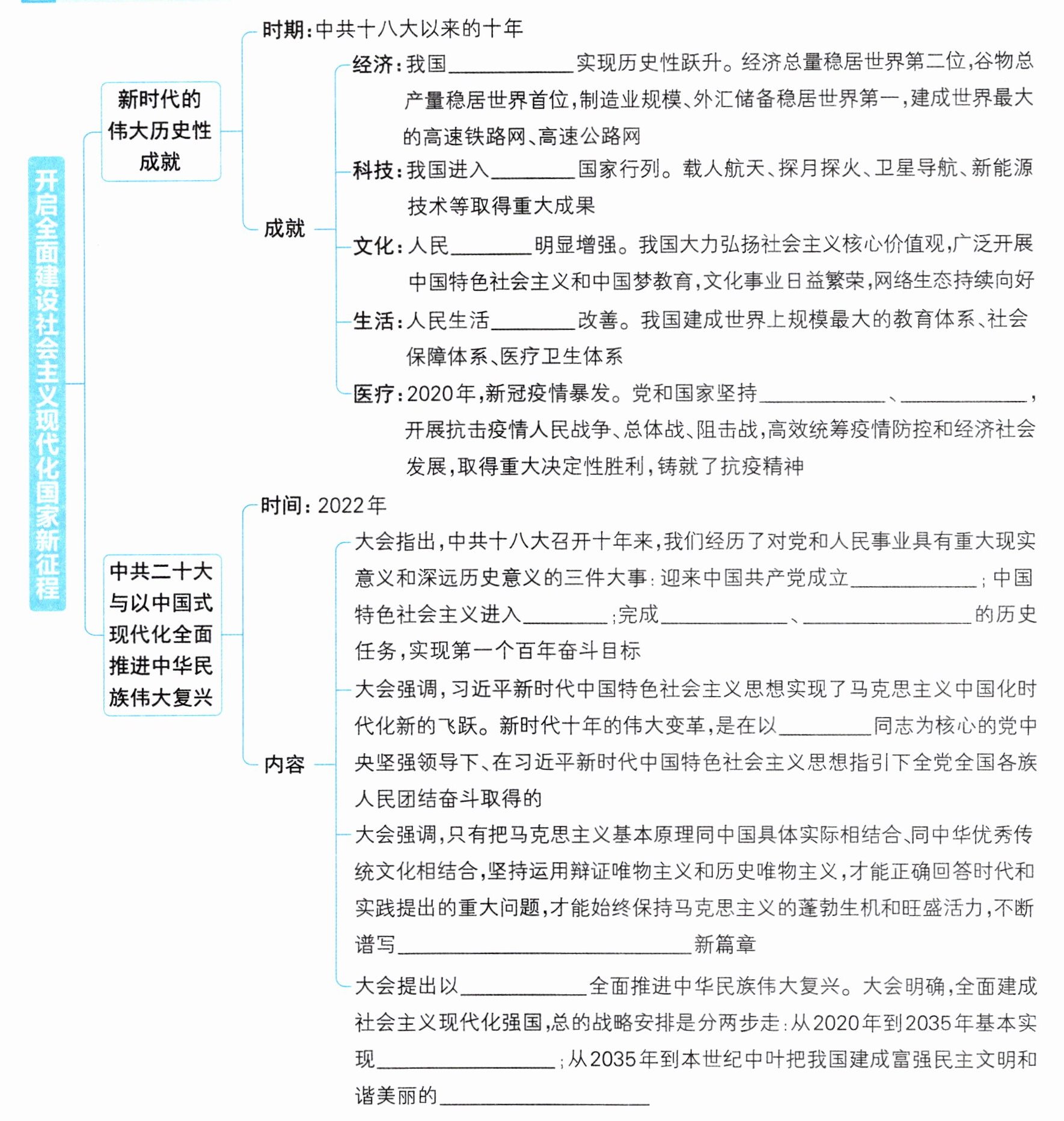 答案:经济实力 创新型 文化自信 全方位 人民至上 生命至上 一百周年 新时代 脱贫攻坚 全面建成小康社会 习近平 马克思主义中国化时代化 中国式现代化 社会主义现代化 社会主义现代化强国