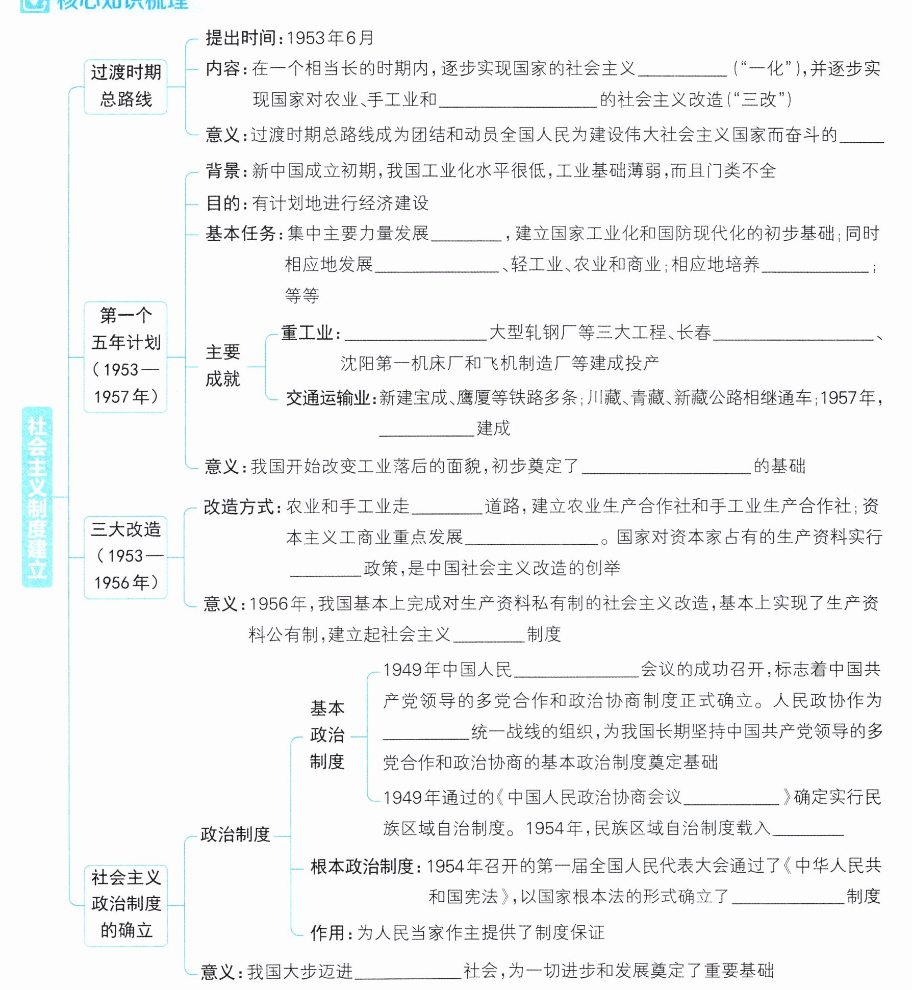 答案:工业化 资本主义工商业 行动纲领 重工业 交通运输业 建设人才 鞍山钢铁公司 第一汽车制造厂 武汉长江大桥 社会主义工业化 合作化 公私合营 赎买 经济 政治协商 人民民主 共同纲领 宪法 人民代表大会 社会主义
