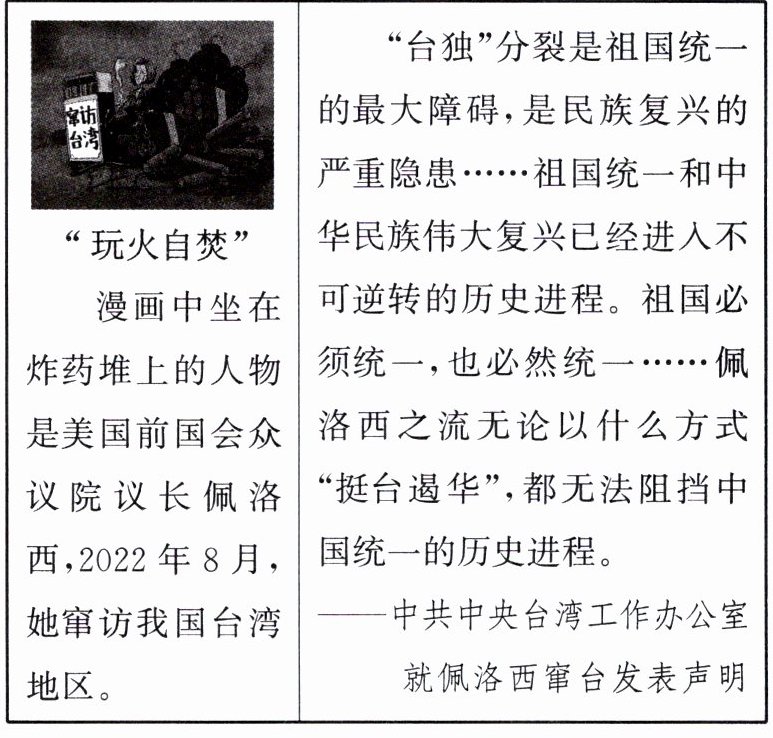 答案:7. (1) 西藏和平解放;中央人民政府领导西藏人民进行民主改革;实行民族区域自治制度。 (2) 伟大构想:“一国两制”。历史意义:洗雪了中华民族百年耻辱,完成了实现祖国完全统一的重要一步;香港、澳门作为直辖于中央政府的特别行政区,重新纳入国家治理体系。 (3) 说明:外国反华分裂势力和“台独”分子是阻碍中国统一的主要障碍;中共中央有决心有能力完成祖国的统一大业。 认识:国家统一是历史发展的大势所趋,是中华民族的根本利益,是中国人民的共同愿望,任何分裂国家的行为都不得民心。