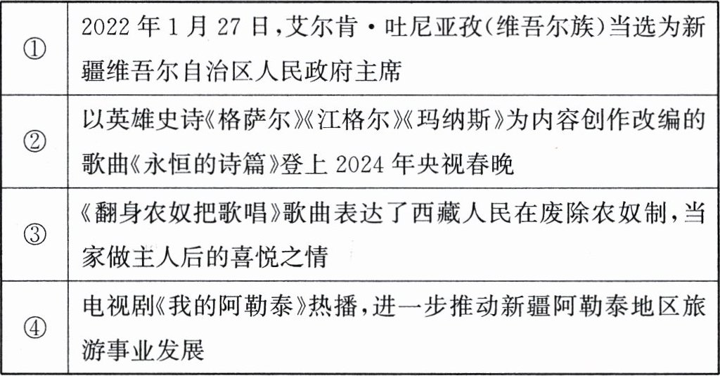 (3)请从以上条目中任选 2 件事(只写序号),结合所学知识论证“坚持和完善民族区域自治制度,不断推进民族团结进步事业,加快民族地区现代化建设步伐”这一观点。(8 分)