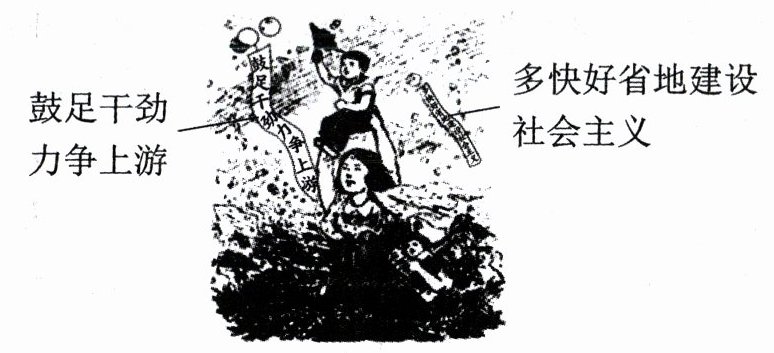 答案:5. C 解析:漫画中人们欢呼雀跃,彩带上写着“鼓足干劲 力争上游”和“多快好省地建设社会主义”的字样,结合所学知识可知,漫画反映了1958年在“总路线”的指导下,人民群众对经济建设的热情高涨,C项正确;社会主义制度的优越性从材料中无法体现,排除A项;三大改造的时间是1953—1956年,与总路线的提出时间不符,排除B项;1958年中共八大二次会议提出的社会主义建设总路线违背了客观经济规律,脱离了当时社会生产力发展水平的实际,排除D项。故选C项。