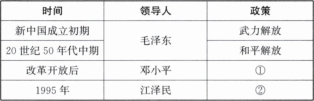 (1)将表格中①②两处内容补充完整,并结合所学知识,说说台湾问题的由来。(6 分)