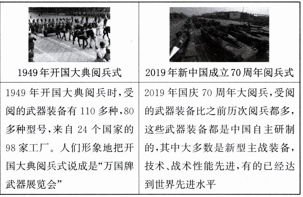 (1)阅读材料一,对比 2019 年与 1949 年阅兵式,概括受阅武器装备发生的变化。这些变化说明了什么?(8 分)
