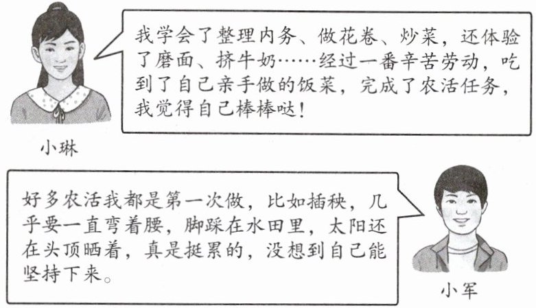 某中学低年级的同学将要参加学农实践活动。但有人抱怨道:“学农有什么用,还不如用这几天补补课。”听到这话,九年级的小琳和小军跟他们分享起了自己的学农感受与收获。