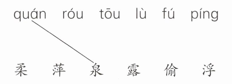根据拼音与汉字的对应关系,将拼音与正确的汉字相连。“quán”对应“泉”,“róu”对应“柔”,“tōu”对应“偷”,“lù”对应“露”,“fú”对应“浮”,“píng”对应“萍”。