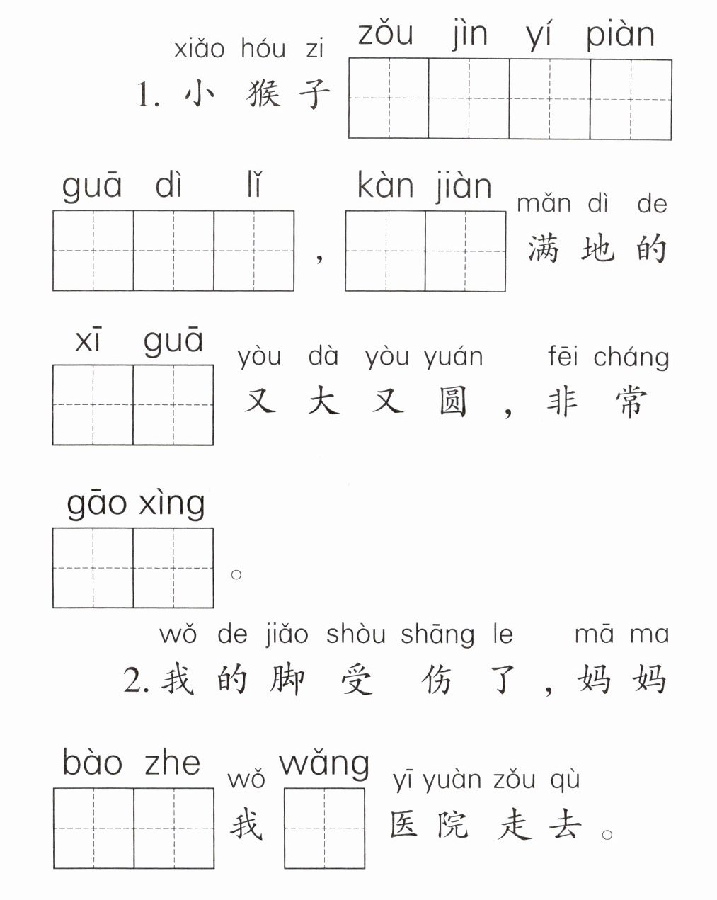 一、1. 走进一片瓜地里 看见 西瓜 高兴 2. 抱着 往