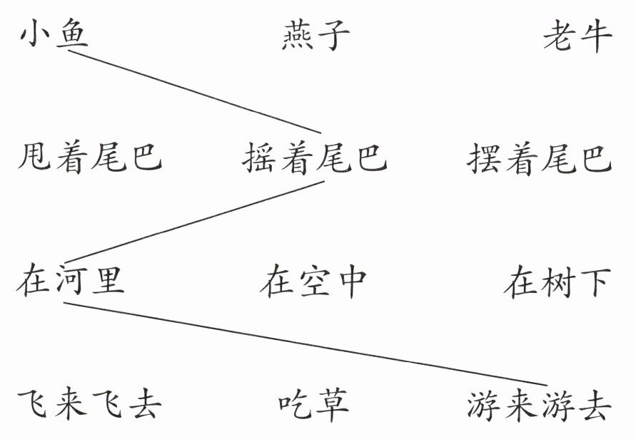 答案:小鱼—摇着尾巴—在河里—游来游去;燕子—摆着尾巴—在空中—飞来飞去;老牛—甩着尾巴—在树下—吃草