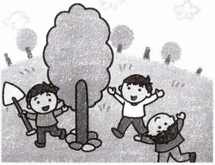 星期天,小伙伴们一起到山坡上种树。小明拿着铁锹挖树坑,小亮把树苗放进树坑,扶正后,小明再用铁锹填好土。小花在旁边高兴地跳着,期待小树快快长大。