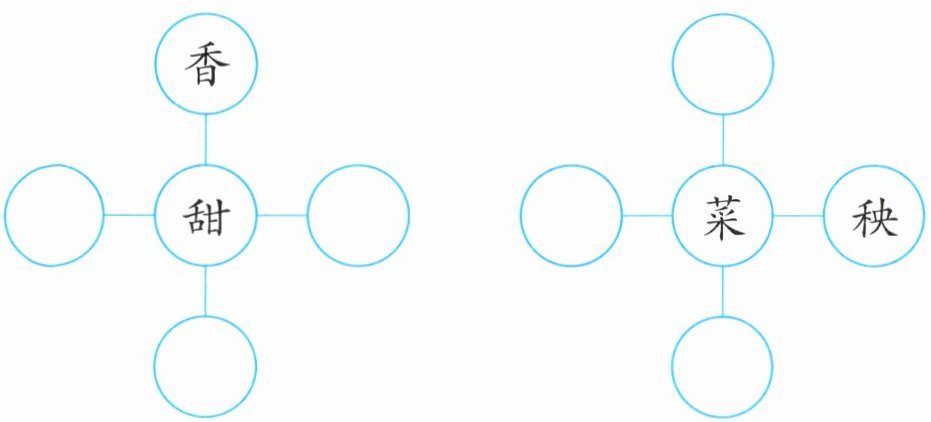 根据“千人糕”相关内容及二年级词汇积累,围绕中心字组词。“甜”可组“蜜、瓜、品”;“菜”可组“白、花、叶”;“劳”可组“动、动、作”;“具”可组“工、玩、文”。