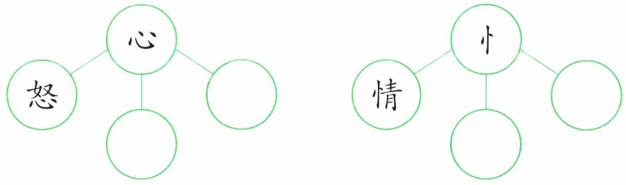 题目中给出了两个中心字“心”和“忄”,以及各自的一个相关字“怒”和“情”。需要根据示例填写与中心字相关的其他字。对于“心”字,常见的相关字有“思”、“想”等;对于“忄”字,常见的相关字有“怀”、“怕”等。通过观察可以发现,“怒”和“情”都是“心”或“忄”字旁的字,都与心情或情感有关。