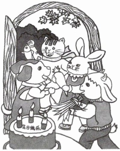 今天是小狗的生日,都有哪些好朋友来了?他们带来了什么礼物呢?请你展开想象,编一个小故事,并用一段通顺的话写下来。