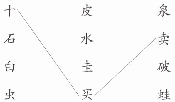 先看左边一列字“十、石、白、虫”,中间一列“皮、水、圭、买”,右边一列“泉、卖、破、蛙”。根据课文《青蛙卖泥塘》及汉字组合知识,“白”和“水”组成“泉”;“虫”和“圭”组成“蛙”;“石”和“皮”组成“破”;“十”和“买”组成“卖”。