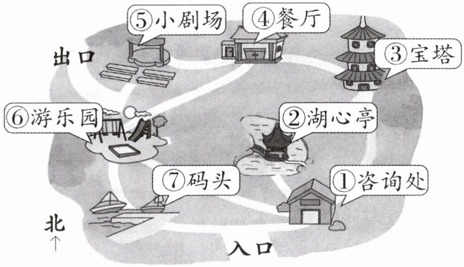 五、结合公园导览图选一选,填序号。