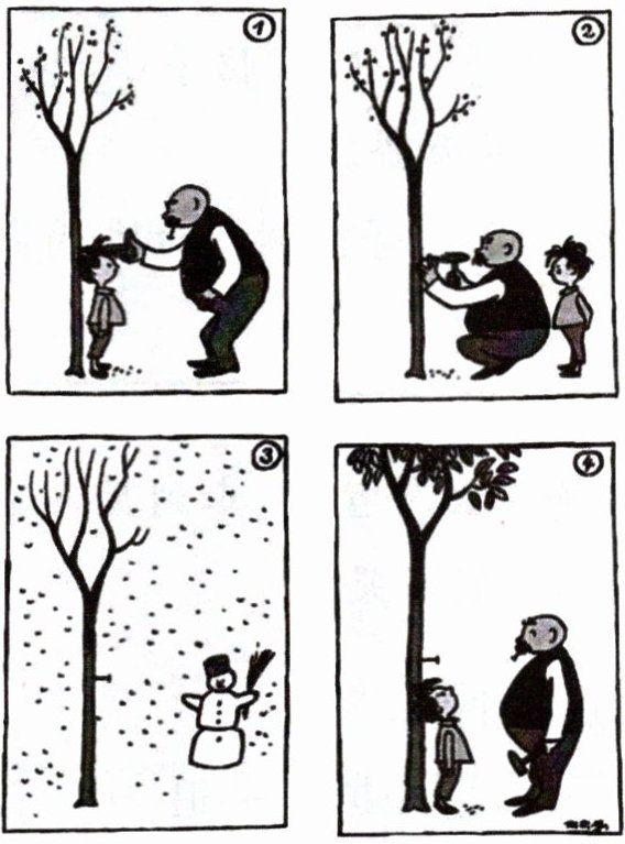 1. 观察图画,确定人物为爷爷和孙子,场景为不同季节的树下;2. 按时间顺序(春→冬→次年春)梳理四幅图内容:春天爷爷给孙子量身高并做标记,冬天标记仍在,次年春天孙子长高,标记位置变低;3. 描写人物动作(爷爷弯腰量身高、画记号,孙子站定、观察)、可能的对话(孙子问“爷爷,这是做什么呀?”,爷爷答“给你做记号,明年看你长多高”)及场景变化(树的叶芽、雪花、绿叶);4. 用通顺语句连贯叙述,体现成长与亲情的意趣。