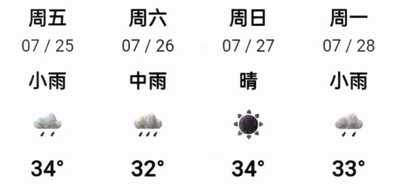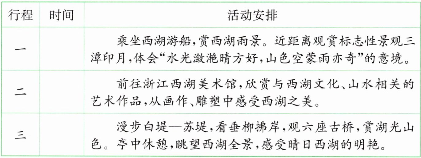 五、小华从书本上学习了苏轼的《饮湖上初晴后雨》之后,就一心想去杭州西湖感受一番。下图是被称为“人间天堂”的杭州连续四日的天气预报。请你结合图中的天气情况和活动安排,推荐合适的出游时间。