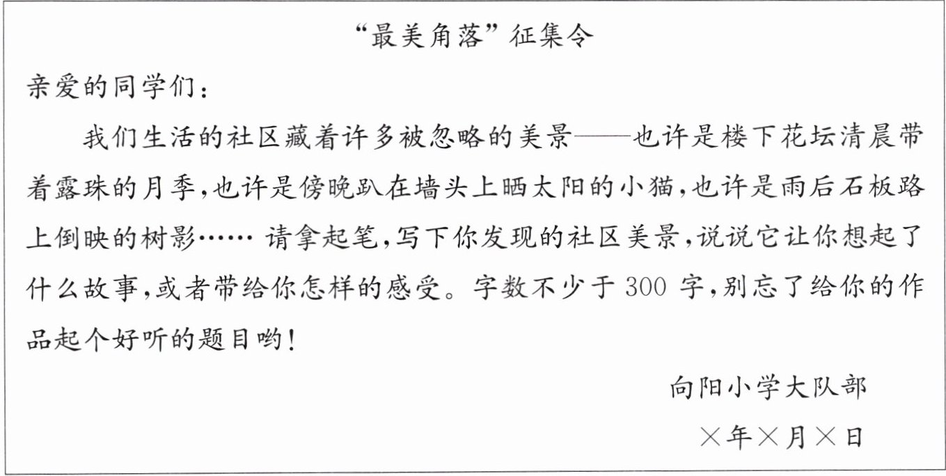 请你根据征集令的要求,完成一篇习作,让更多人看到身边的美好。