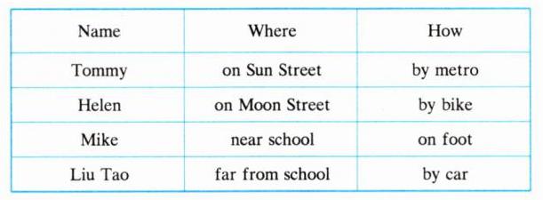 .答案:1. does, live, lives near 2. do, come to, by car 3. Does, by metro, doesn’t, on foot