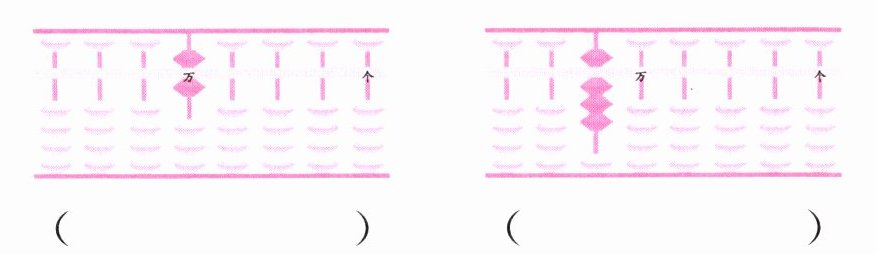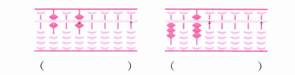 答案:第一个算盘万位上有1颗上珠,表示1个万,写作10000;第二个算盘万位上有1颗上珠和3颗下珠,1颗上珠表示5,3颗下珠表示3,共8个十万,写作800000。第三个算盘在百万有一个上珠和一个下珠,在万位也有一个上珠和一个下珠,所以是6000000+60000=6060000。第四个算盘在千万有三个下珠,在十万有一个上珠和三个下珠,所以是30300000。