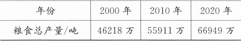 以下是我国 2000 年、2010 年和 2020 年粮食产量统计表。
