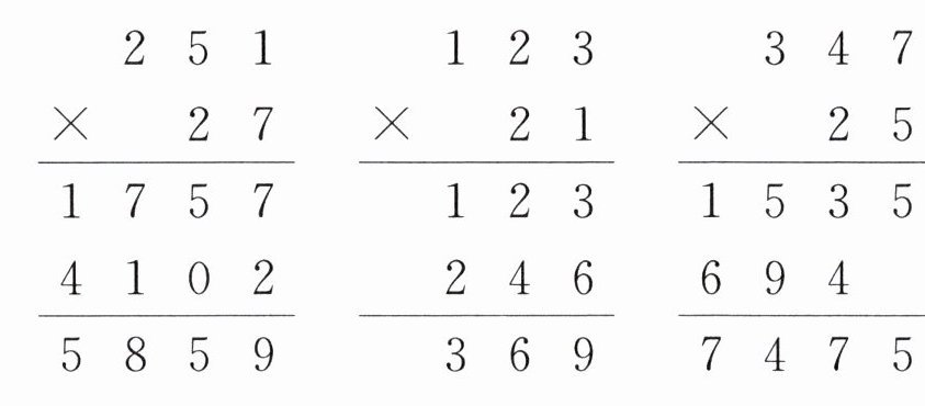 $\begin{array}{r} 251\\ ×27\\ \hline 1757\\ 4102\\ \hline 5859\end{array} $ $\begin{array}{r} 123\\ ×21\\ \hline 123\\ 246\\ \hline 369\end{array} $ $\begin{array}{r} 347\\ ×25\\ \hline 1535\\ 694\\ \hline 7475\end{array} $