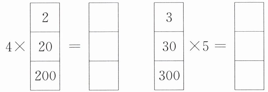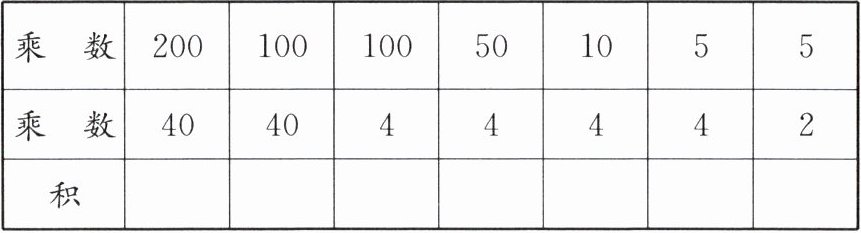 计算各乘法算式的积:200×40=8000;100×40=4000;100×4=400;50×4=200;10×4=40;5×4=20;5×2=10。观察发现:一个乘数不变,另一个乘数乘(或除以)几(0除外),积也乘(或除以)几。