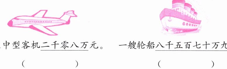 一架中型客机$\underline{二千零八万}$元。 一艘轮船$\underline{八千五百七十万九千}$元。