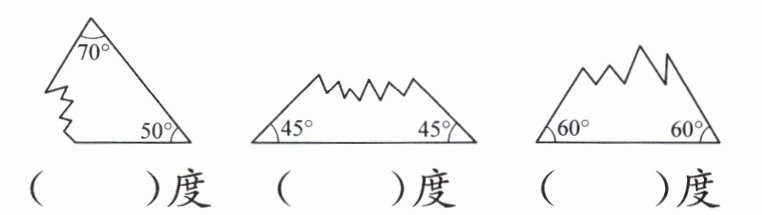 3. 下面的三张三角形纸片都被撕去了一个角。算出撕去的角各是多少度。