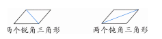 同样从平行四边形的一个顶点向它的对边(非顶点)画一条线段,在右边平行四边形中,从右上角顶点向对边(非顶点)画线段,可将平行四边形分成两个三角形(其中可以满足两个三角形都是钝角三角形的情况,比如斜的平行四边形,以较长的底边为底,从上方短边的一个顶点向下方长边非顶点连线可得到两个钝角三角形 )。