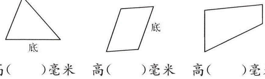 3. 梯形:从上底的一个顶点向下底作垂线,这点和垂足之间的线段就是高。测量得高为12毫米。