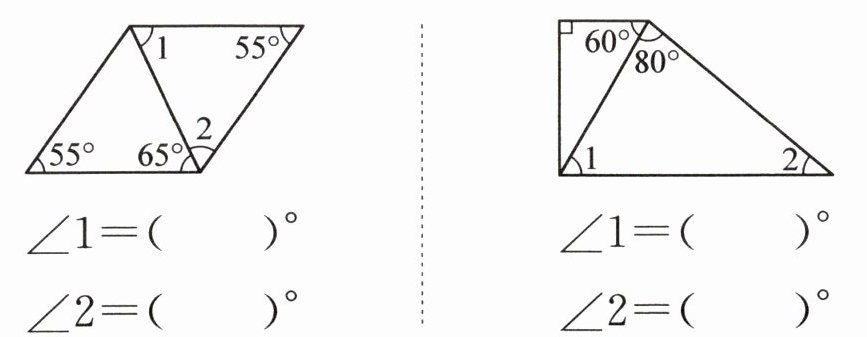 第一个图形:左下方三角形内角和180°,∠1=180°-55°-65°=60°;∠2与65°角组成平角,∠2=180°-65°=115°。第二个图形:直角被分成60°和30°,中间三角形内角和180°,∠2=180°-30°-80°=70°;大直角三角形两锐角和90°,∠1=90°-70°=20°。