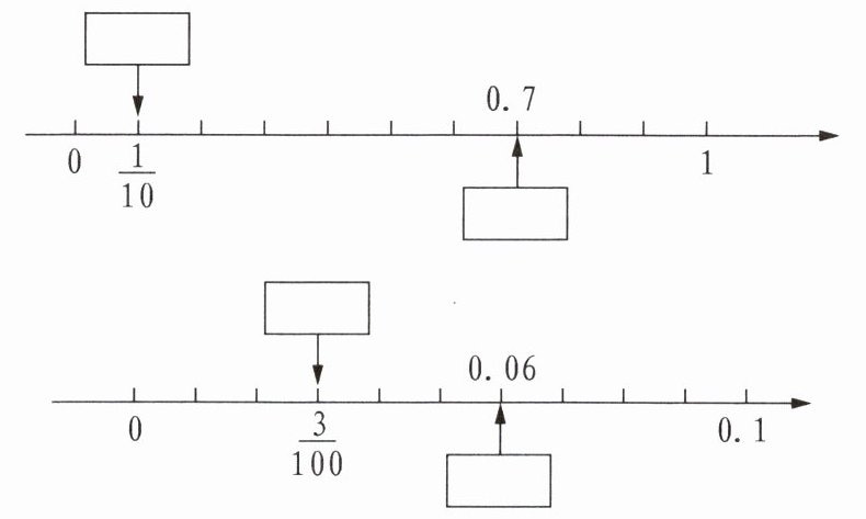 第一幅图,0到1平均分成10份,每份是$\frac{1}{10}$即0.1,第一个箭头指向第1份,填0.1;0.7对应的分数是$\frac{7}{10}$。第二幅图,0到0.1平均分成10份,每份是0.01即$\frac{1}{100}$,$\frac{3}{100}$是0.03,0.06对应的分数是$\frac{6}{100}$。