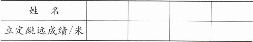 首先需实际调查几名同学的立定跳远成绩并填入表格(假设调查4名同学成绩分别为:小明1.8米、小红1.6米、小刚1.9米、小丽1.7米)。(1)比较成绩大小:1.9>1.8>1.7>1.6,所以小刚成绩最好。(2)从高到低排序为:1.9米(小刚)、1.8米(小明)、1.7米(小丽)、1.6米(小红)。