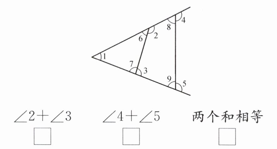 4. 观察下图,$∠2 + ∠3$的和,与$∠4 + ∠5$的和,哪一个大?在正确的答案下面画“√”。