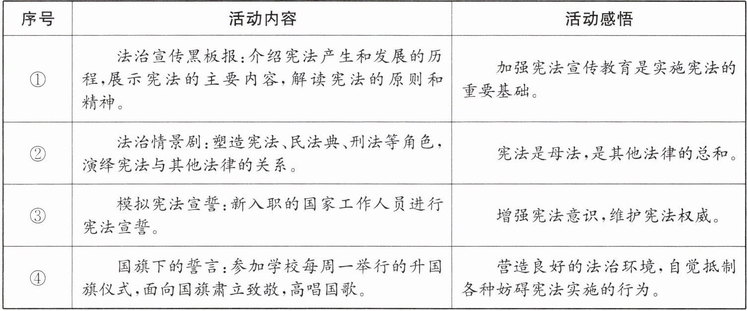 本题可根据尊崇宪法的相关知识,对每个活动内容及感悟逐一进行分析。