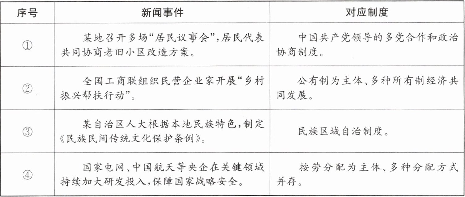 ①“居民议事会”属于基层群众自治制度,对应“中国共产党领导的多党合作和政治协商制度”错误;②民营企业家帮扶行动体现非公有制经济作用,对应“公有制为主体、多种所有制经济共同发展”正确;③自治区人大制定条例体现民族区域自治制度,正确;④央企研发投入体现国有经济作用,对应“按劳分配为主体、多种分配方式并存”错误。正确的是②③。