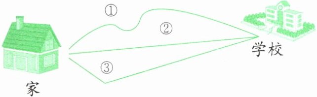 2. 小明从家到学校有三条路可走,哪条路最近?为什么?请你帮小明想一想。